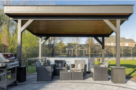 A covered outdoor kitchen with a fireplace has become a coveted feature in...